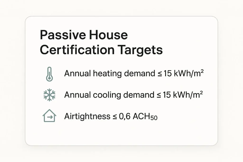 This summary box highlights the stringent performance targets required for Passive House certification.