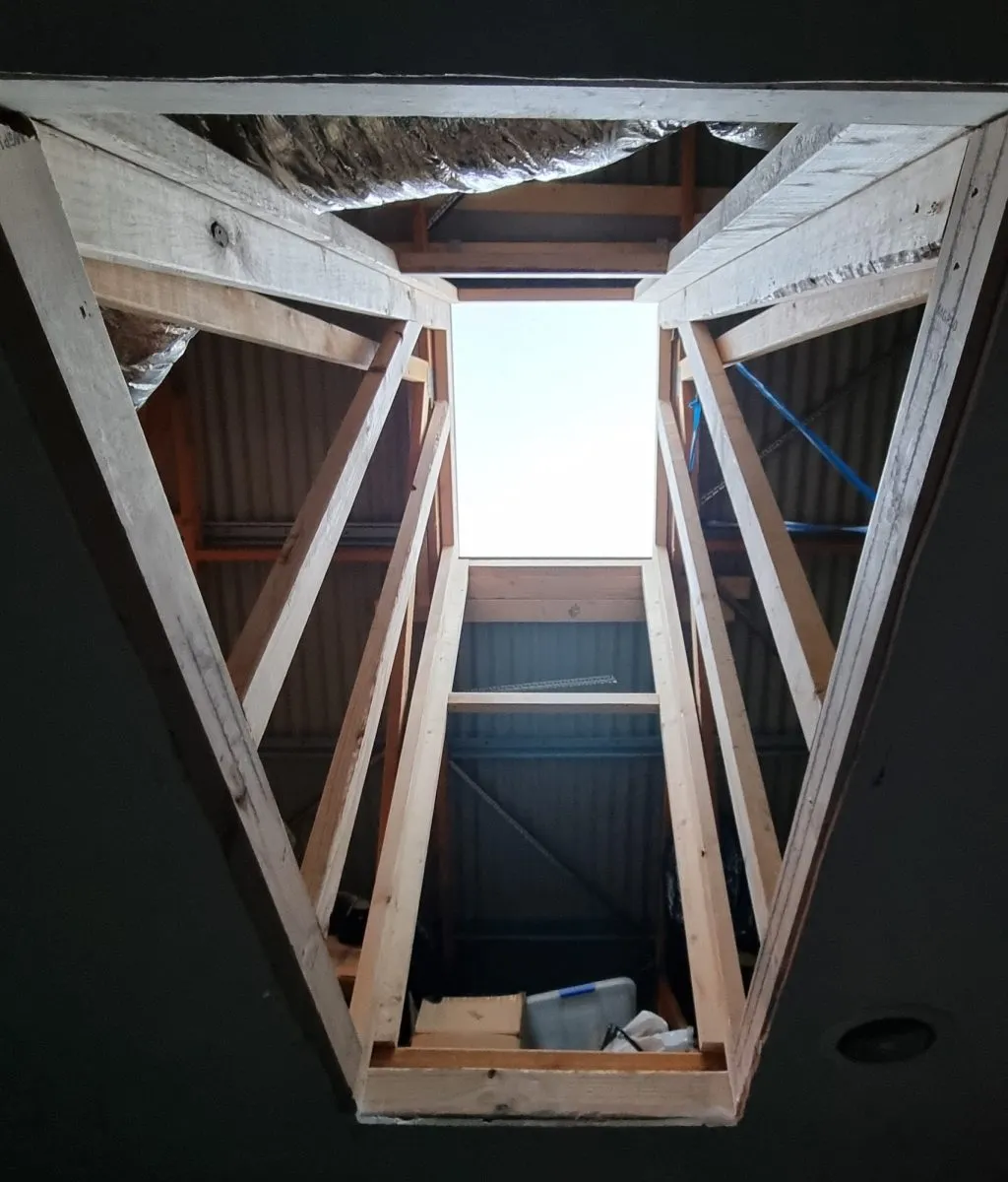 With the skylight secure on the roof, you can head back inside to build the tunnel that connects it to your ceiling. This is the light shaft, and it’s what directs all that lovely sunlight into the room. You’ll construct a simple timber frame that runs from the roof opening down to the ceiling opening you cut earlier.